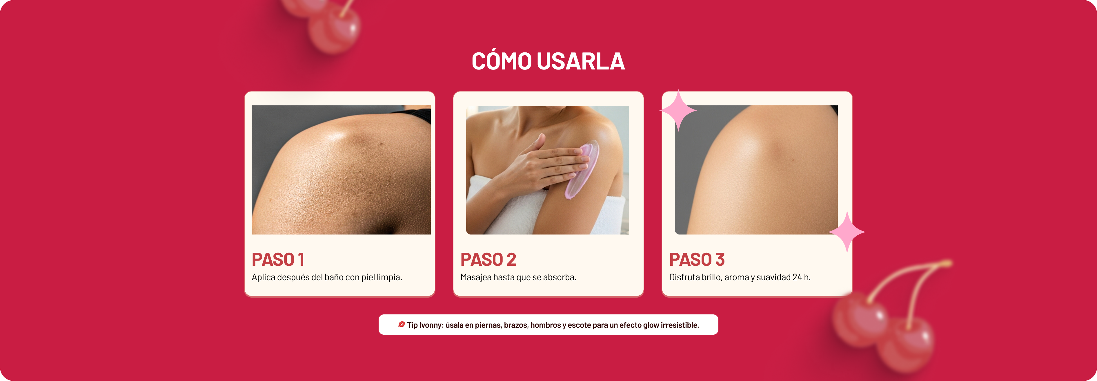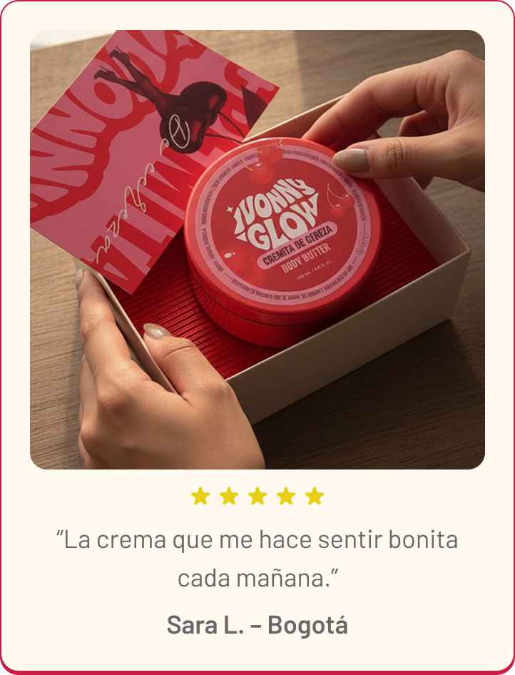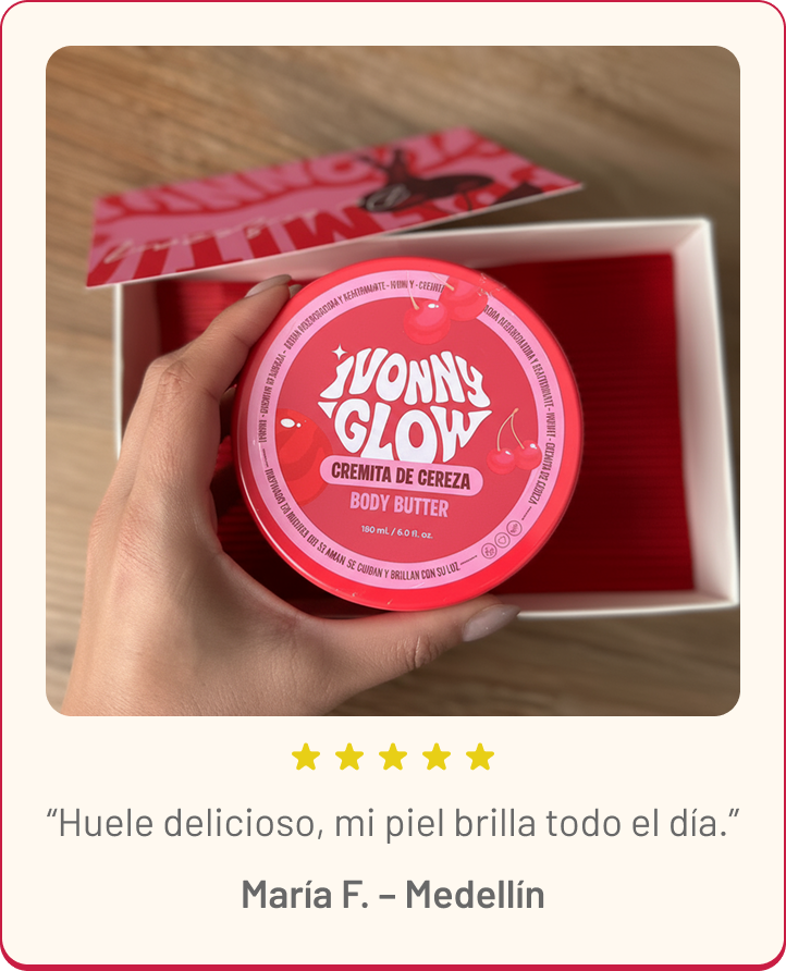 Después de usar Ivonny Glow cremita de Cereza, tu piel se transforma, revelando una versión más radiante, suave y luminosa. Hidrata profundamente, mejora la textura de la piel y proporciona un brillo saludable que destaca tu belleza natural.